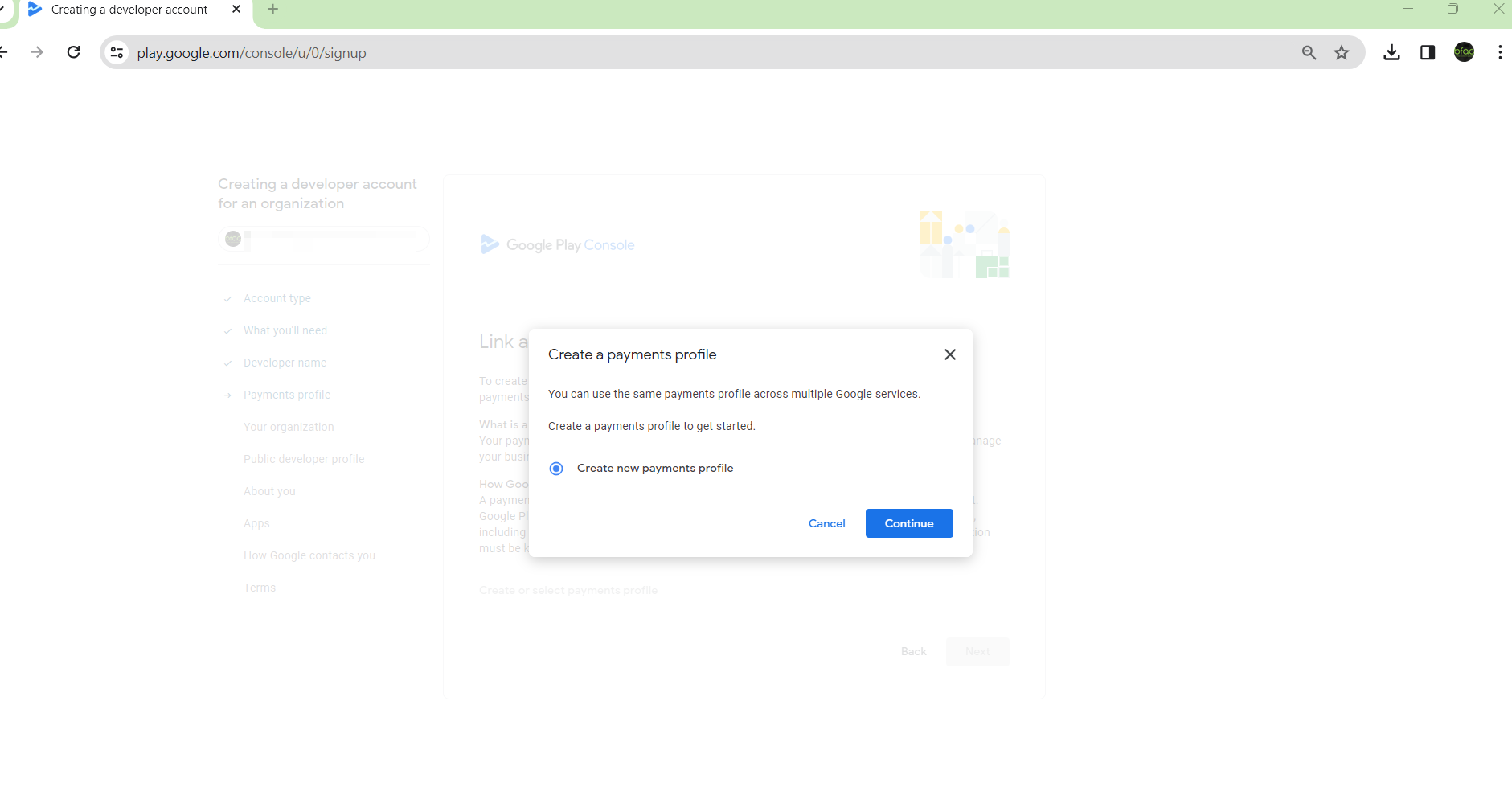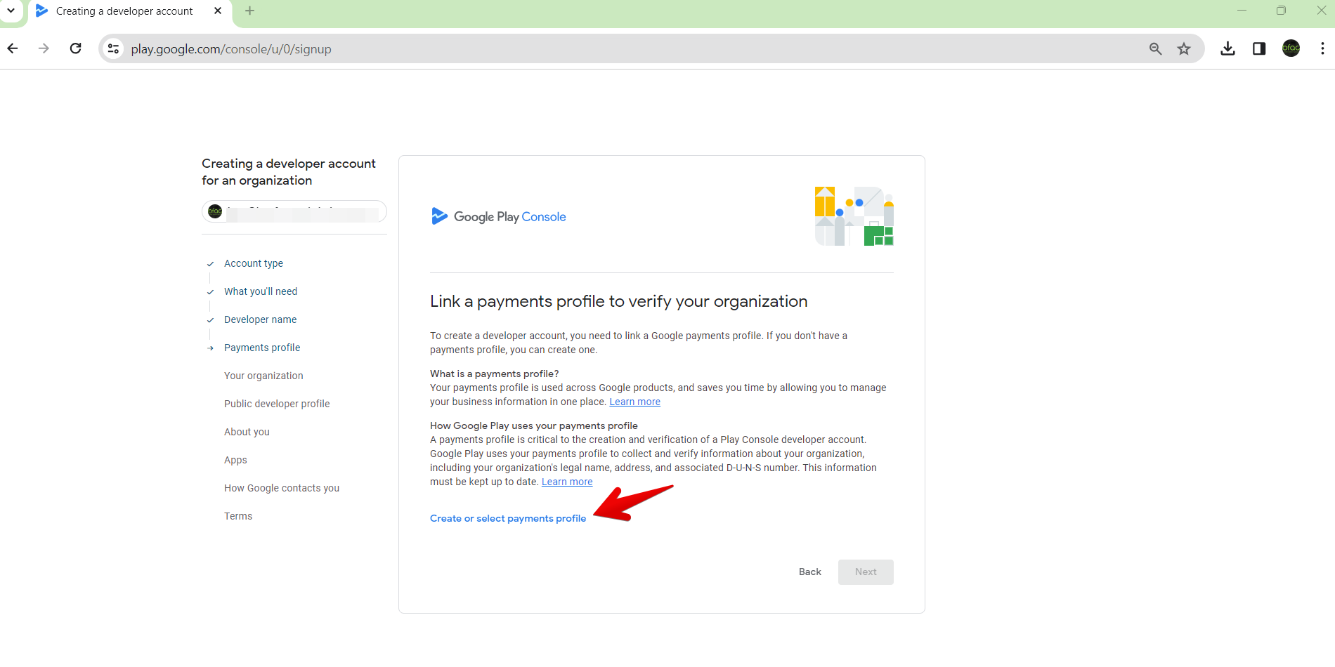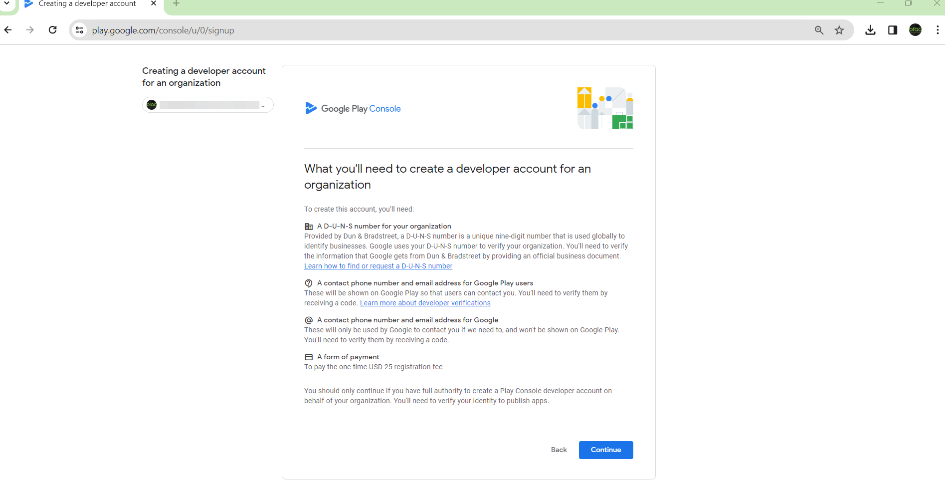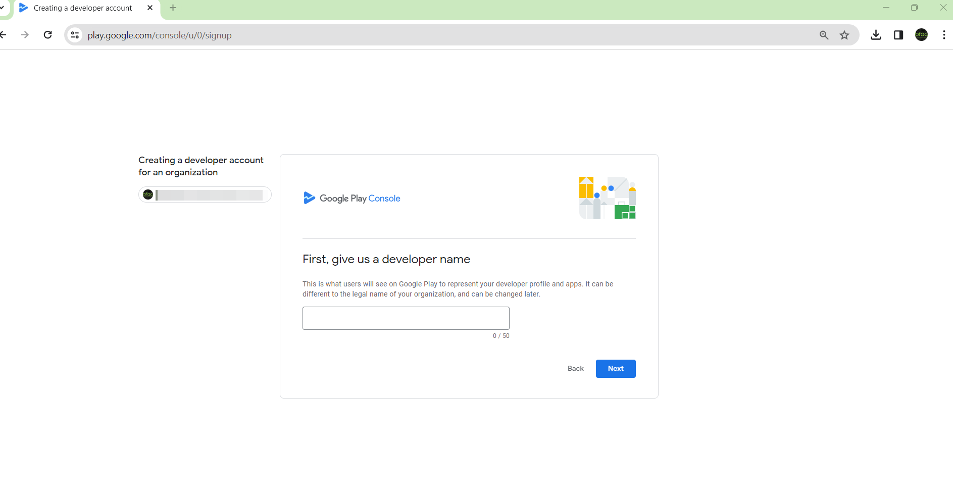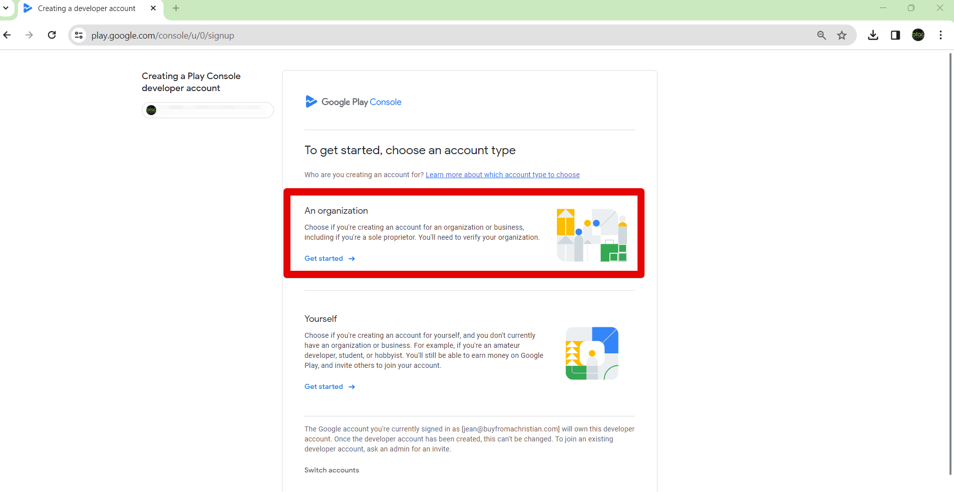 - Select to create a developer account for “An Organization or Business”